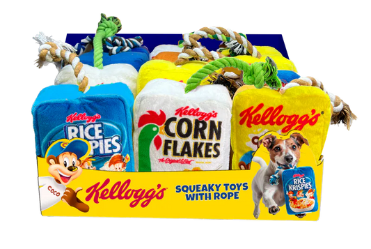 YWOW PETZ KELLOGG'S SQUEAKY TOY WITH ROPE(RICE KRISPIES)